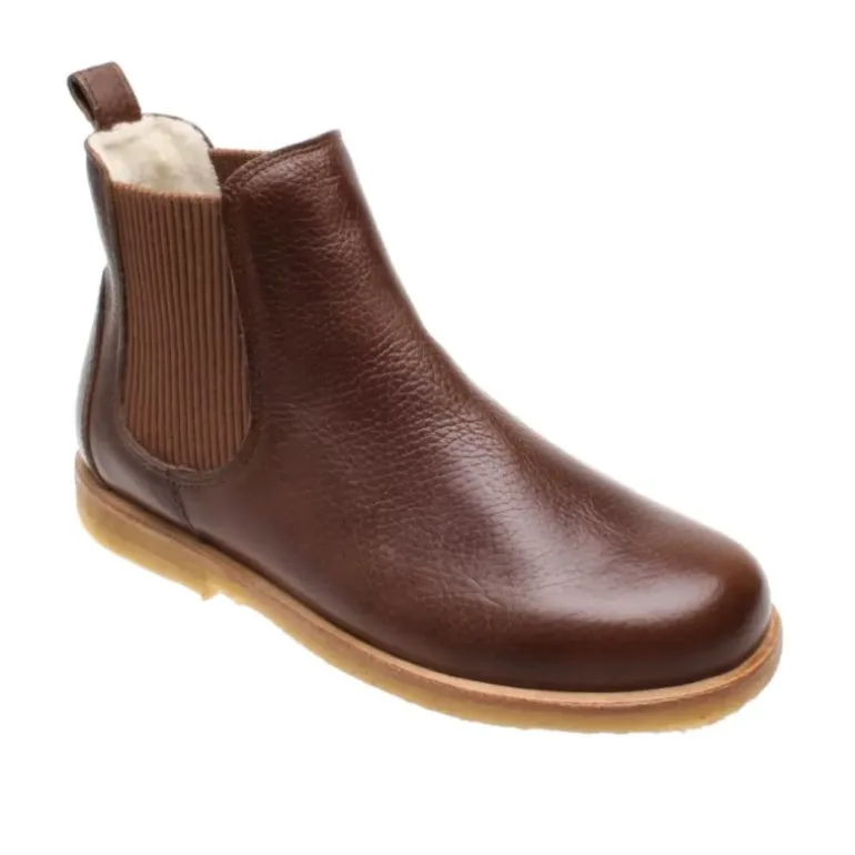 Klassisk chelsea støvle fra Angulus i brun skind, med uldfoer indvendigt. Bløde rågummisåler, samt en dejlig varm støvle, der er smart og let i udtrykket.