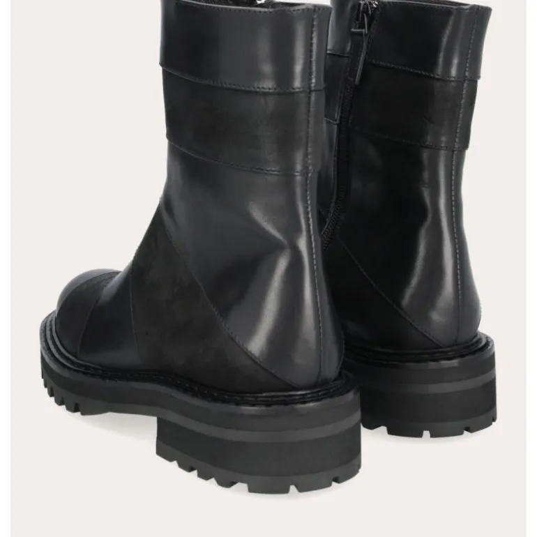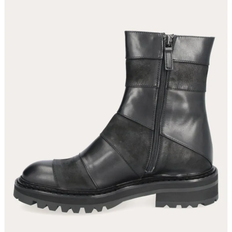 Super fede håndlavet støvler udført i sort glat skind kombineret med varese. Støvlen er dekoreret med patchworks i skind og varese, hvilket giver et flot og råt udtryk.. På indersiden har støvlen en lynlåse, samt smarte grove gummisåler.