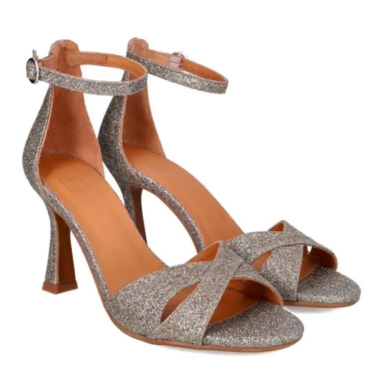 Rigtig smuk sandal med den flotteste hæl fra Billi Bi, i et fantastisk multi glitter materiale. Sandalen har krydsrem fortil, lukket hælkappe samt ankelrem. En helt unik og enestående flot sandal. Hælen måler ca. 9 cm