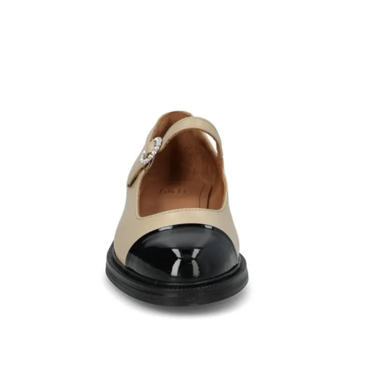 Ballarina inspireret ‘Mary Jane’ sko fra Billi Bi med en fin rem over foden, i beige skind med sort laksnude fortil. Skoen har et fint og feminint simili spænde, som kan justeres, og som bare har den smukkeste effekt.