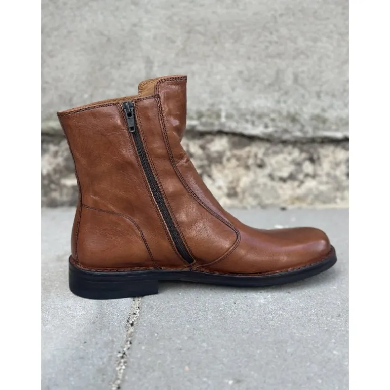 Klassisk støvle fra Bubetti i cognac skind med lynlåse på indersiden og spænde på ydersiden. Støvlen er nu blevet lavet på en ny læst, som er lidt bredere. Skindet Bubetti bruger er altid vegetabilsk garvet, og støvlen er håndsyet. Derfor giver samt tilpasser støvlen sig helt perfekt til foden! Sålerne er skind belagt med gummi, og kan altid forsåles. Støvlen slutter flot til benet ved skaftet. Der skal evt bruges skohorn de første par gange man skal i den. En bubetti støvle kan holde helt utrolig mange år.