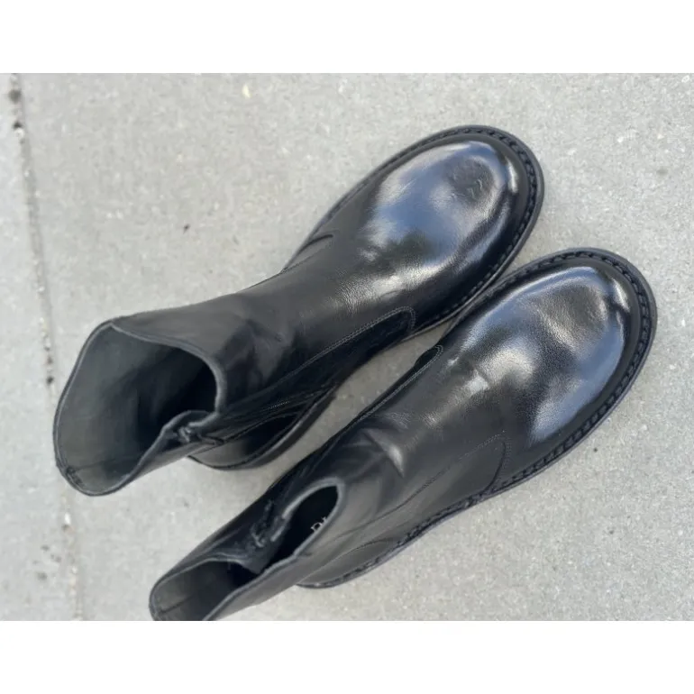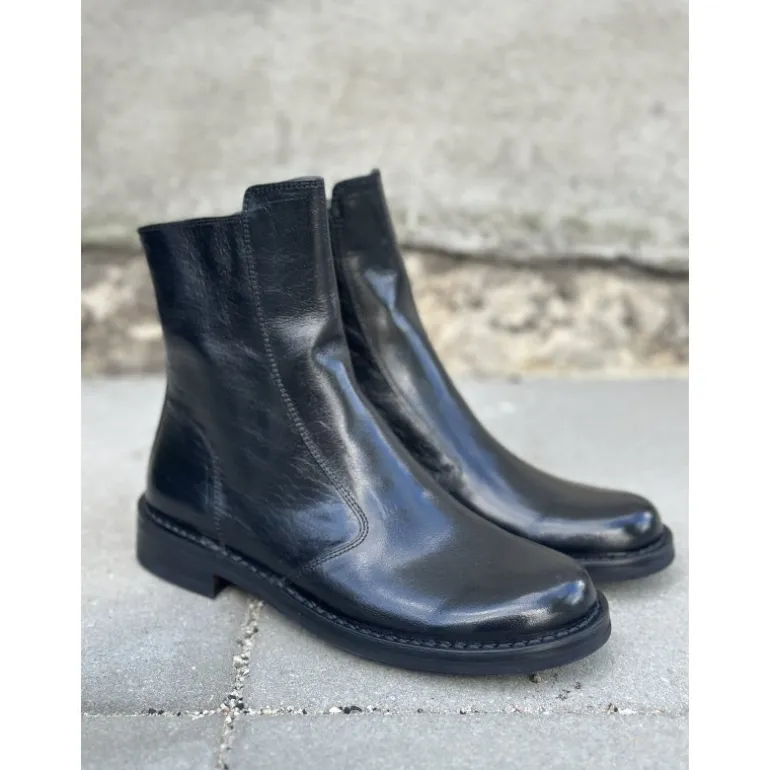 Klassisk støvle fra Bubetti i sort skind med lynlåse på indersiden. Støvlen er nu blevet lavet på en ny læst, som er lidt bredere. Skindet Bubetti bruger er altid vegetabilsk garvet, og støvlen er håndsyet. Derfor giver samt tilpasser støvlen sig helt perfekt til foden! Sålerne er skind belagt med gummi, og kan altid forsåles. Støvlen slutter flot til benet ved skaftet. Der skal evt bruges skohorn de første par gange man skal i den. En bubetti støvle kan holde helt utrolig mange år.