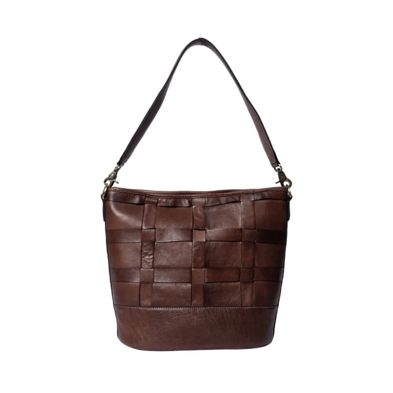 Meget flot større taske fra RE:DESIGNED, i den flotte mørkebrune skind, med bredflettet detaljer. Tasken har to forskellige remme med til, så man kan justere den efter ønske.