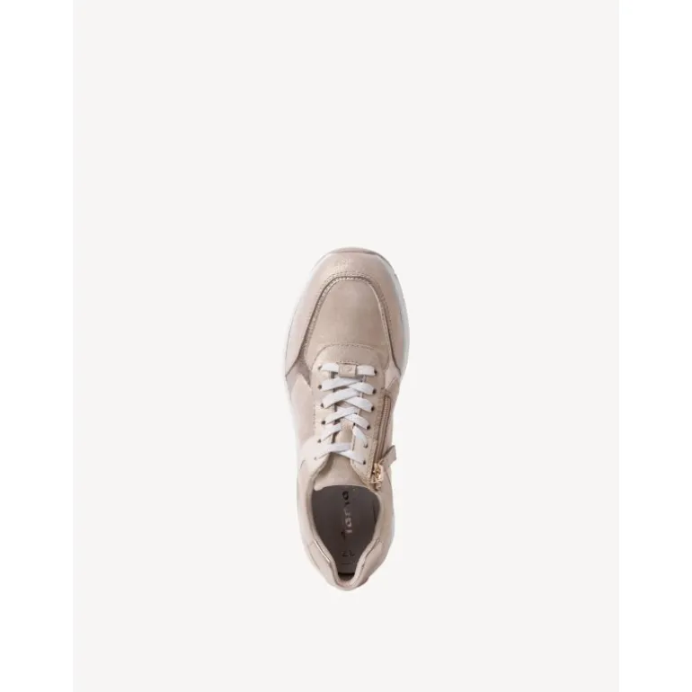 En utrolig lækker sneakers fra Tamaris, i champagne farve kombinationer af lækkert skind. Skoen er fra Tamaris PURE RELAX kollektion, og der er derfor ekstra meget komfort i, og lidt mere plads til fødderne. Fortil er der snøre, og på indersiden en lynlåse der gør det nemt at tage skoen af og på.