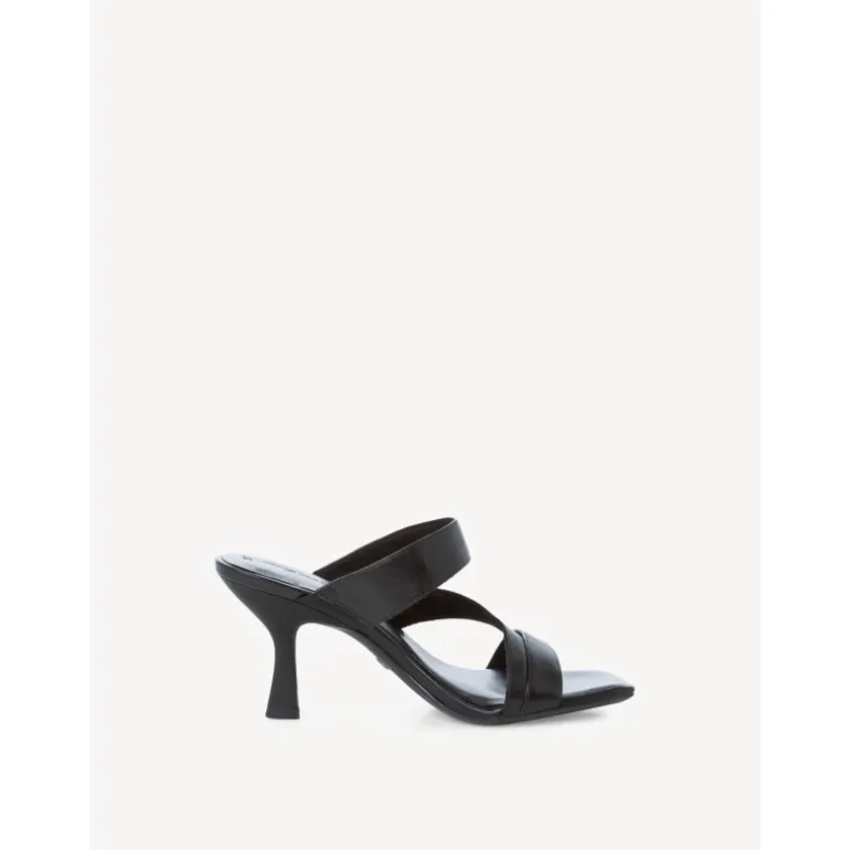 Meget elegante og flotte slip in sandal stiletter fra Tamaris i sort skind. Sandalen har en kantet snude, og en helt ny smart flot hæl. Sidder godt på foden.