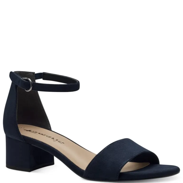 Super fine og elegante sandaler fra Tamaris i blå tekstil, med en lille blokhæl. Remmen omkring anklen er med velcro.
