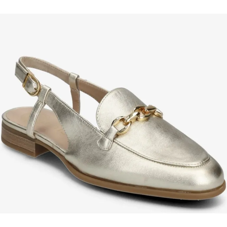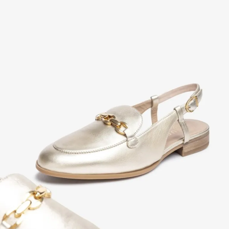 Meget flotte loafers i guld skind, med slingback bagtil. Remmen kan spændes ind, så den tilpasses foden. Smuk guld kæde fortil, som giver en fin detalje.