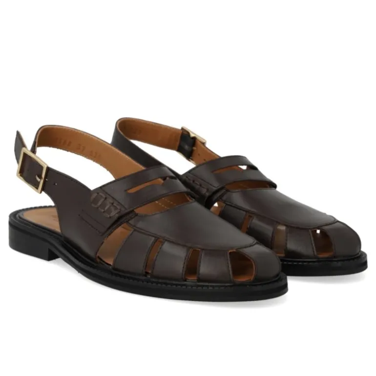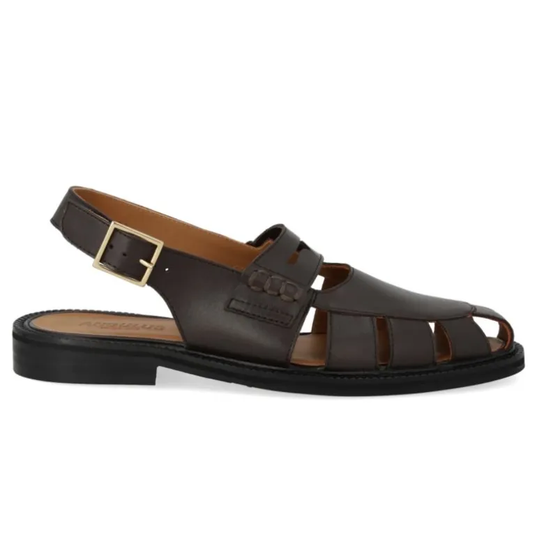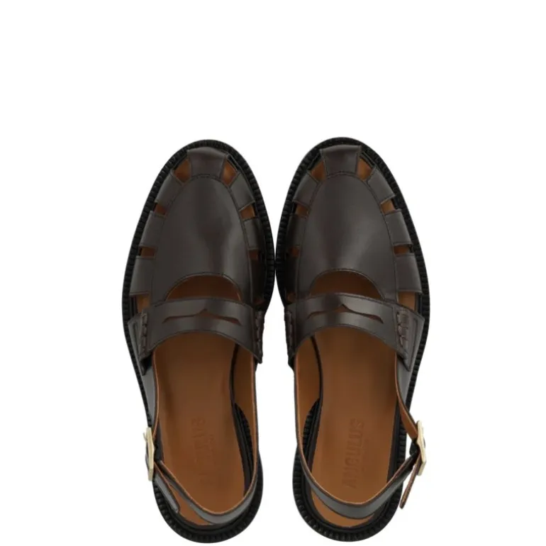 Meget lækker åben loafer fra Angulus. Skoen er i en flot mørkebrun skind, med slingback rem og et guld spænde.