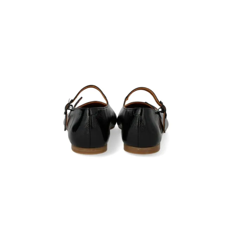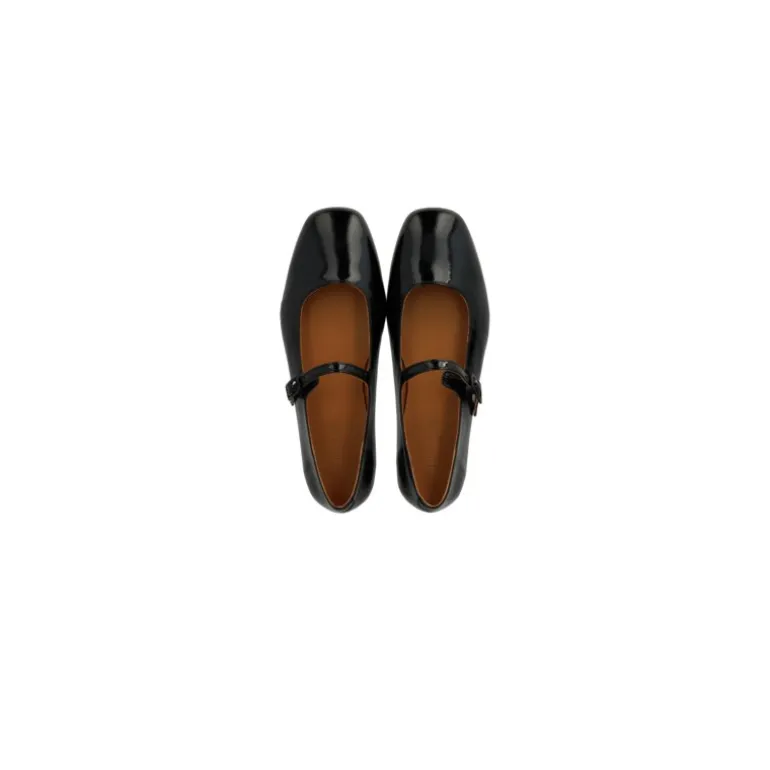 Meget flot og feminin Mary Jane ballerina sko i sort lak skind, med en moderat firkantet snude. Skoen har en lækker vatteret indersål, som giver en blød komfort. Justerbar rem over foden. Pæn til både bare fødder og en smart strømpe i.
