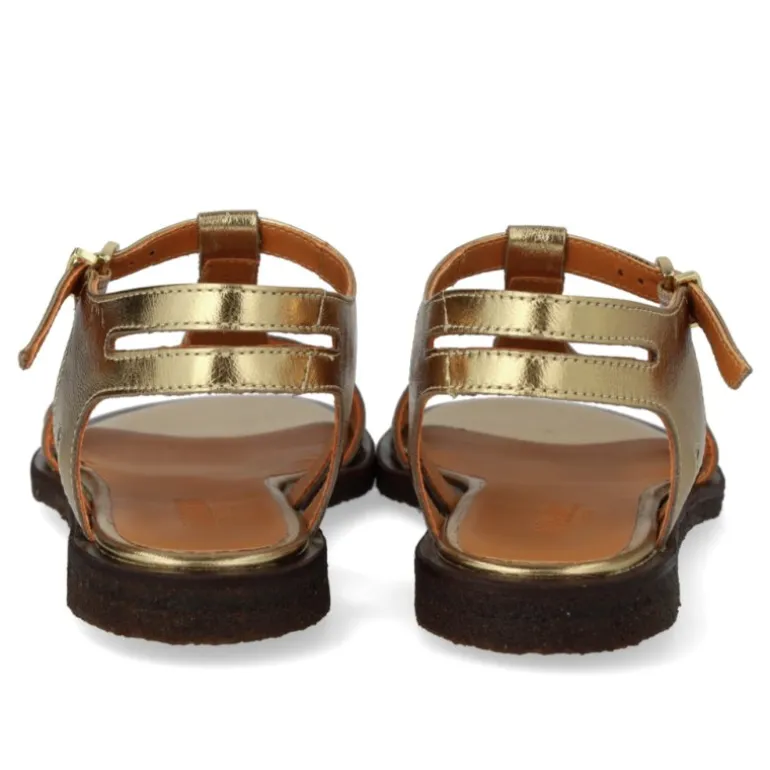 En bestseller sandal fra Angulus, som har fået en opgradering. Sandalen er i guld skind, og er lavet på de nye mørke rågummisåler, som giver et eksklusivt udtryk. Fantastisk komfort.