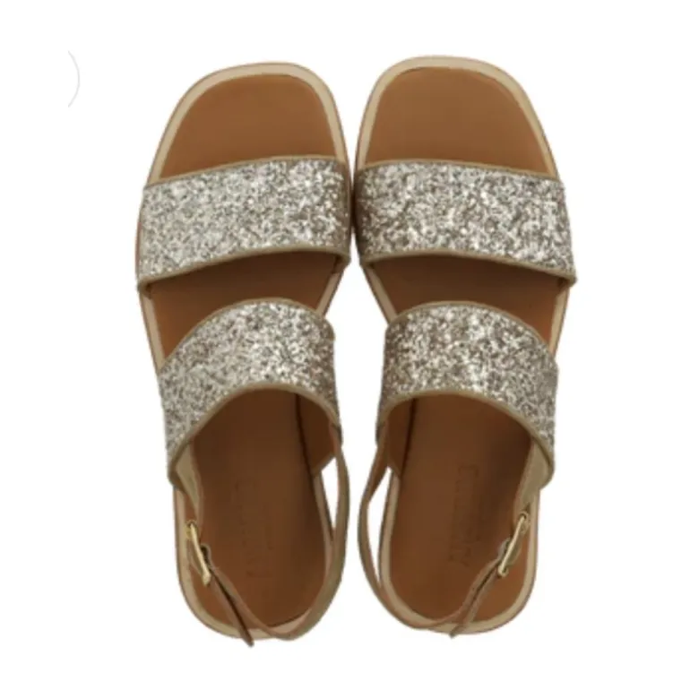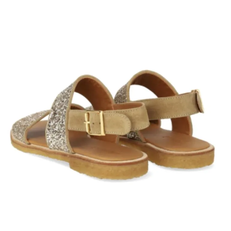 En lækker ny glittersandal fra Angulus, med to remme over foden, og ruskind bagtil. Sålen er en helt ny ekstra blød sål, som er polstret indvedigt, og kan foldes helt samme. Fantastisk komfort.