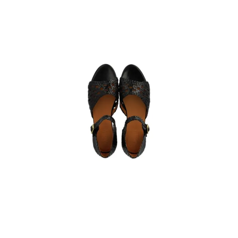 Meget flotte og elegante sandaler fra Angulus, i sort håndflettet skind. Sandalen har lukket hælkappe, og rem over foden.