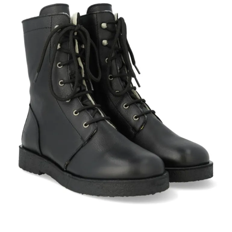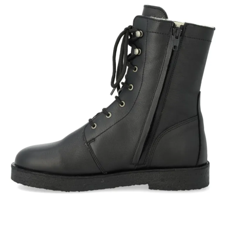 De lækreste vinterstøvler fra Angulus i sort skind, med lynlåse på indersiden og snøre fortil. Støvlen er foret med 100% uldfoer. Lækre bløde rågummisåler .