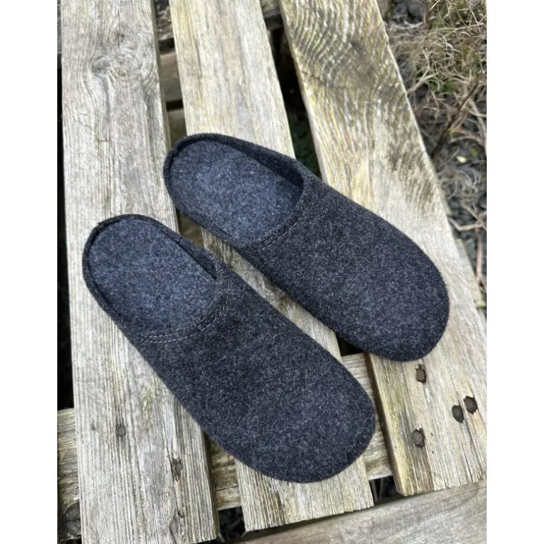 Klassisk lækker slip in hjemmesko i mørkegrå uld. Hjemmeskoen har faste gummisåler under