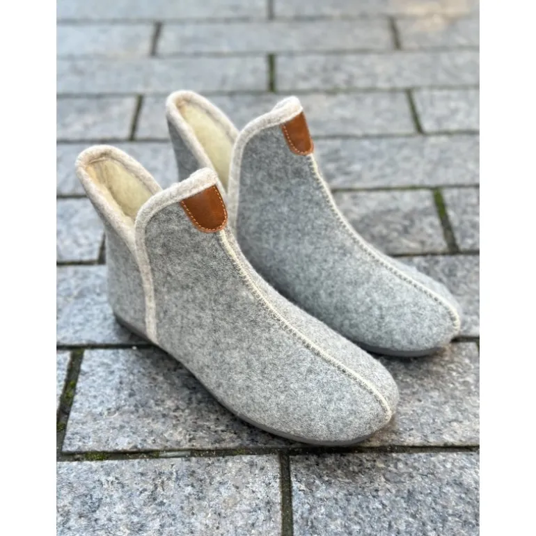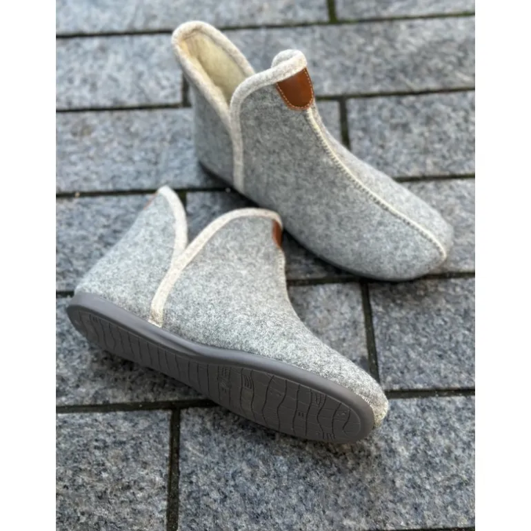 Super skøn hjemmesko, i en lille støvle model, i lysegrå, med lækkert uldfoer indvendigt. Hjemmeskoene er lige til at stikke ned i, med en fast gummisål, der er slidstærk og kan tåle lidt af hvert. Har en V udskæring i siderne.