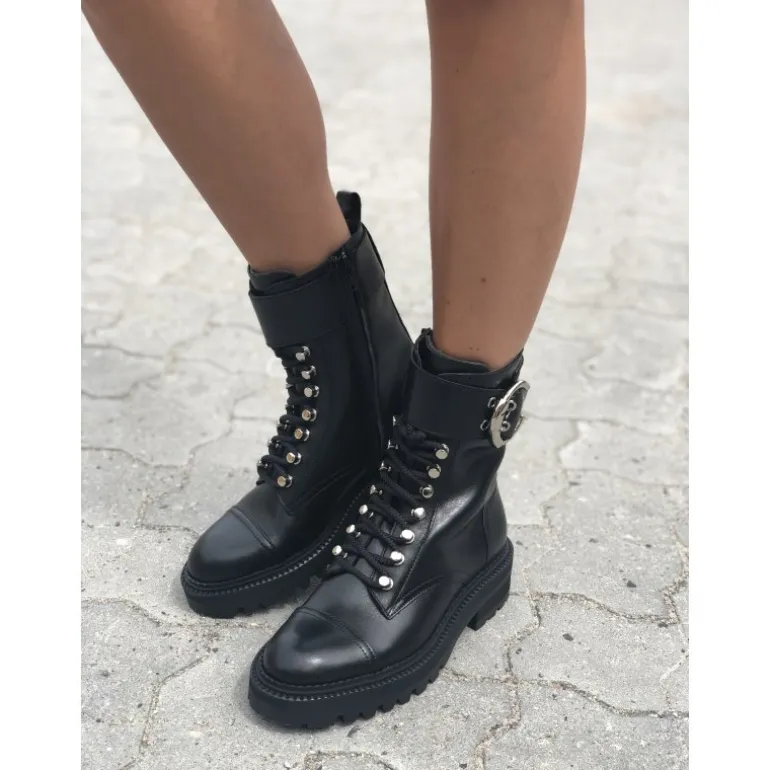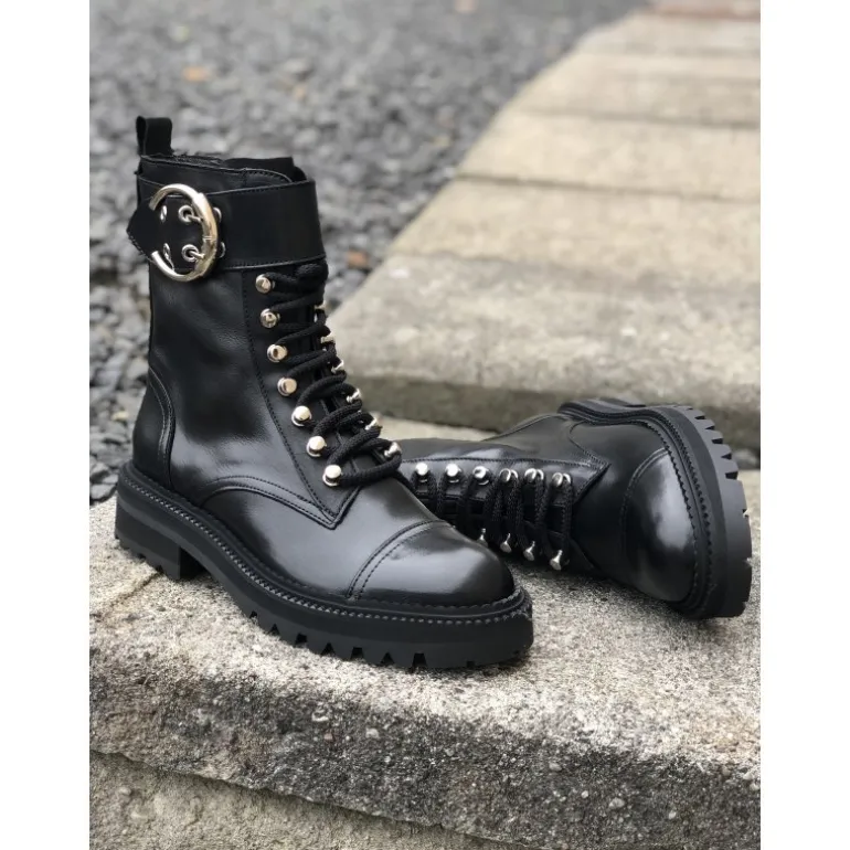Rigtig fed snørestøvle fra Billi Bi, i sort glat skind, med lynlåse på indersiden, rigtig flot spænde på ydersiden, og grove gummisåler. Super cool look, og perfekt til både bukser og kjoler.