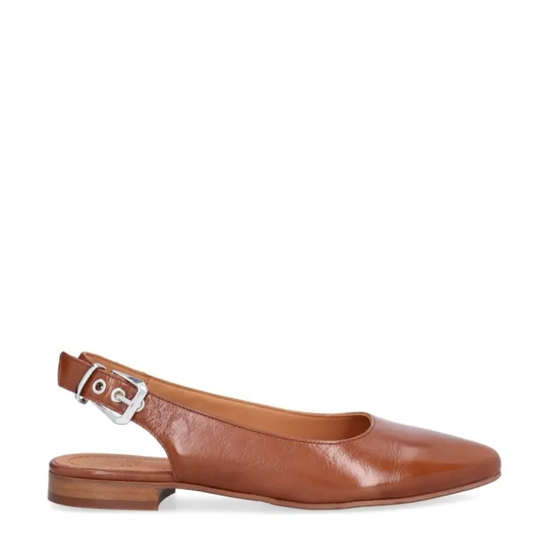 Ballerina sko i cognac lakskind, med en lidt spids snude, og et flot sølv spænde bagtil.