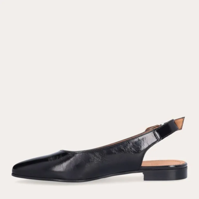 Ballerina sko i sort lakskind, med en lidt spids snude, og et flot sølv spænde bagtil.