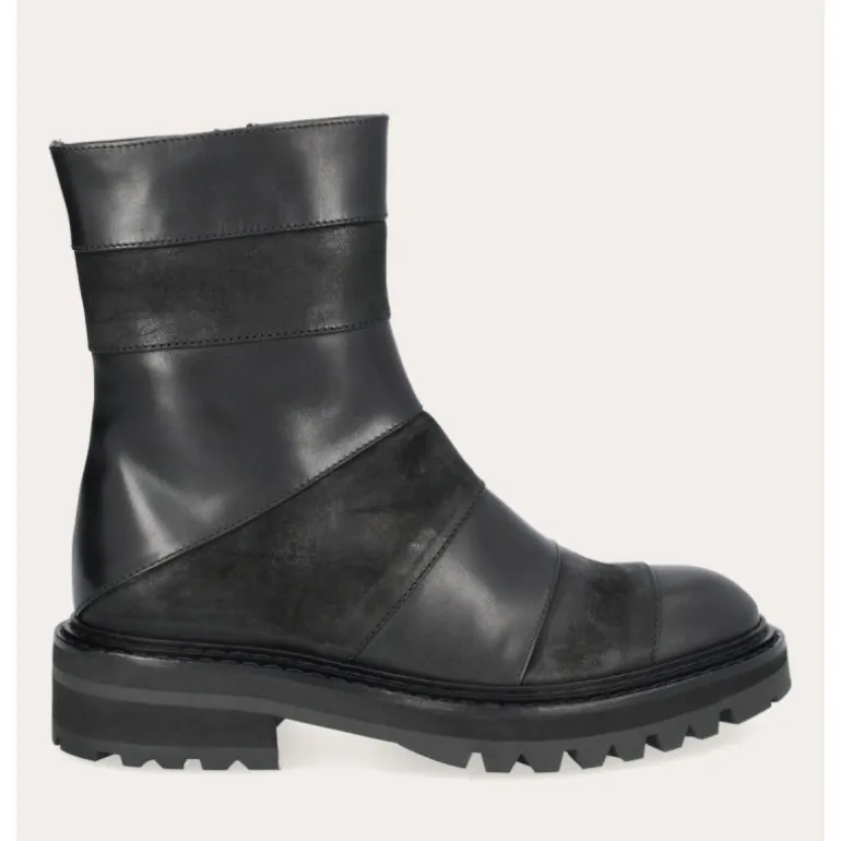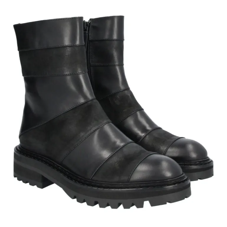 Super fede håndlavet støvler udført i sort glat skind kombineret med varese. Støvlen er dekoreret med patchworks i skind og varese, hvilket giver et flot og råt udtryk.. På indersiden har støvlen en lynlåse, samt smarte grove gummisåler.