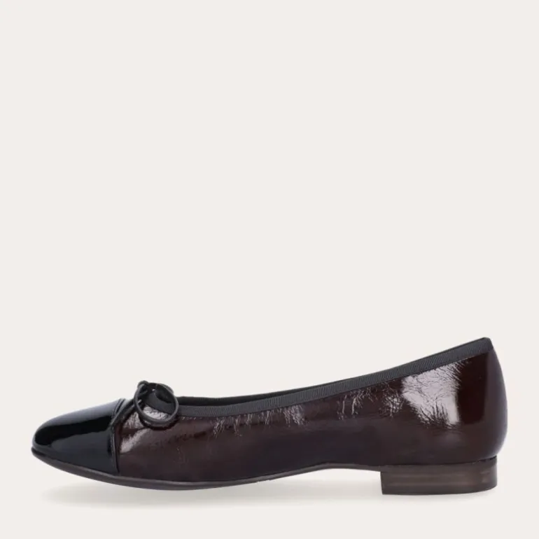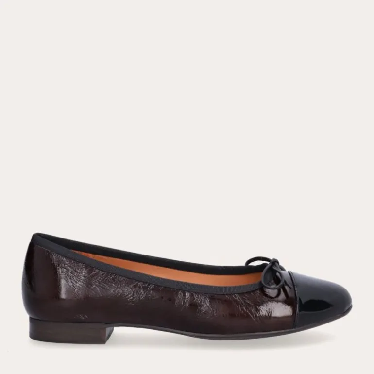 En smuk håndsyet klassisk ballerina sko fra Billi Bi i brunlig lakeret skind, med rund sort lakeret snude, med en flot sløjfe fortil. Skoen har de blødeste sacchetto såler, hvilket giver maksimal komfort og bevægelighed. Den vil tilpasse sig til din fod, og gøre hvert skridt til en fornøjelse.