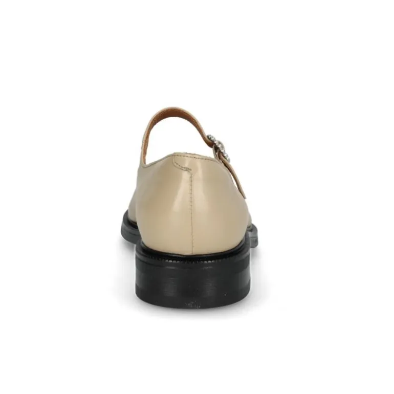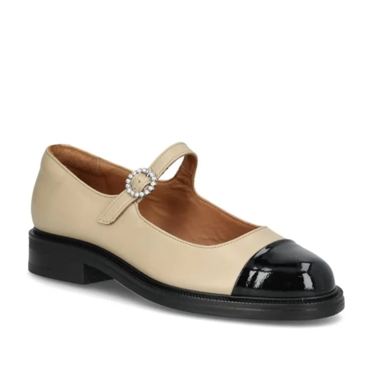 Ballarina inspireret ‘Mary Jane’ sko fra Billi Bi med en fin rem over foden, i beige skind med sort laksnude fortil. Skoen har et fint og feminint simili spænde, som kan justeres, og som bare har den smukkeste effekt.