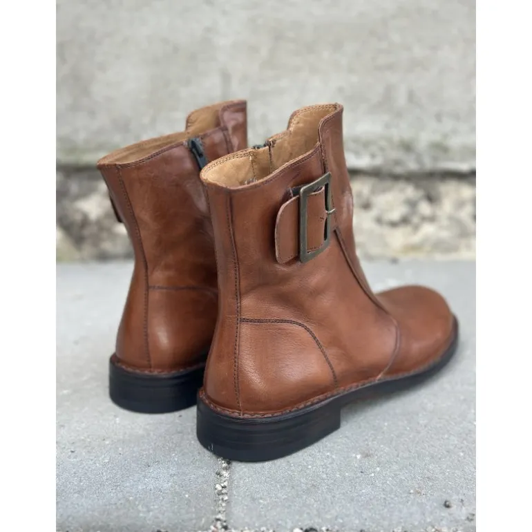 Klassisk støvle fra Bubetti i cognac skind med lynlåse på indersiden og spænde på ydersiden. Støvlen er nu blevet lavet på en ny læst, som er lidt bredere. Skindet Bubetti bruger er altid vegetabilsk garvet, og støvlen er håndsyet. Derfor giver samt tilpasser støvlen sig helt perfekt til foden! Sålerne er skind belagt med gummi, og kan altid forsåles. Støvlen slutter flot til benet ved skaftet. Der skal evt bruges skohorn de første par gange man skal i den. En bubetti støvle kan holde helt utrolig mange år.
