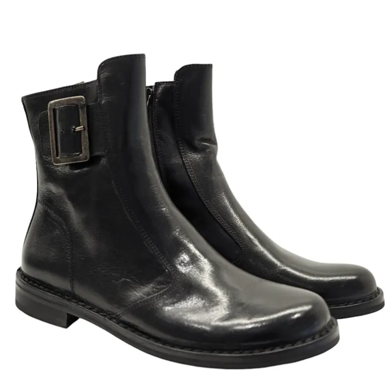 Klassisk støvle fra Bubetti i sort skind med lynlåse på indersiden og spænde på ydersiden. Støvlen er nu blevet lavet på en ny læst, som er lidt bredere. Skindet Bubetti bruger er altid vegetabilsk garvet, og støvlen er håndsyet. Derfor giver samt tilpasser støvlen sig helt perfekt til foden! Sålerne er skind belagt med gummi, og kan altid forsåles. Støvlen slutter flot til benet ved skaftet. Der skal evt bruges skohorn de første par gange man skal i den. En bubetti støvle kan holde helt utrolig mange år.
