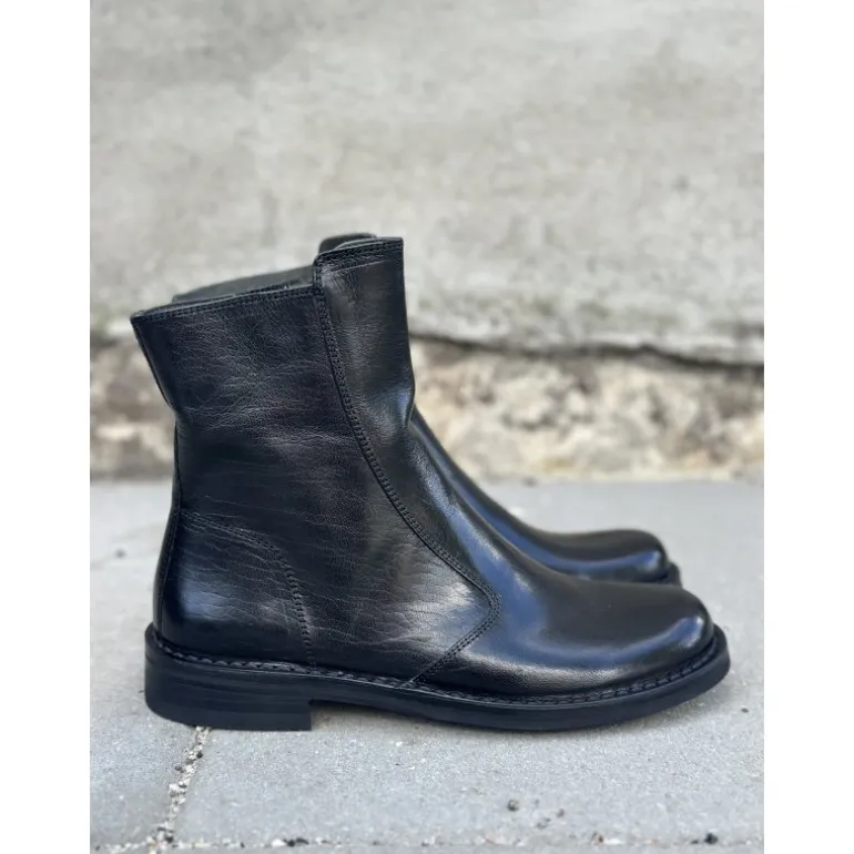Klassisk støvle fra Bubetti i sort skind med lynlåse på indersiden. Støvlen er nu blevet lavet på en ny læst, som er lidt bredere. Skindet Bubetti bruger er altid vegetabilsk garvet, og støvlen er håndsyet. Derfor giver samt tilpasser støvlen sig helt perfekt til foden! Sålerne er skind belagt med gummi, og kan altid forsåles. Støvlen slutter flot til benet ved skaftet. Der skal evt bruges skohorn de første par gange man skal i den. En bubetti støvle kan holde helt utrolig mange år.