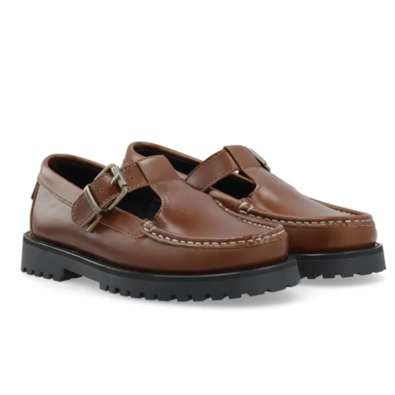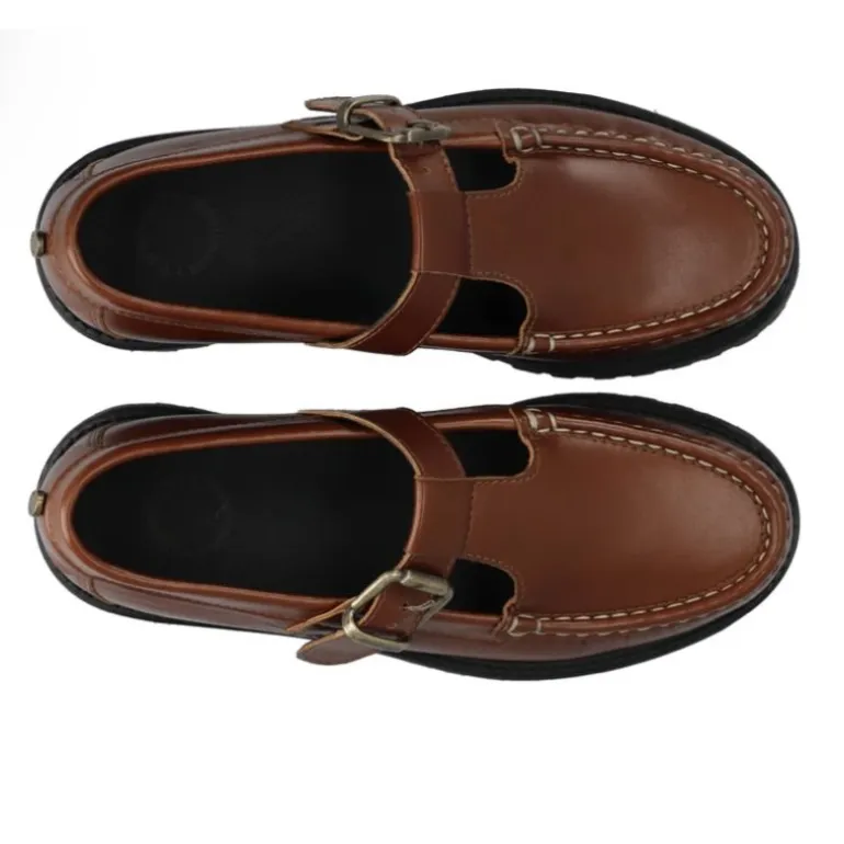 Super smarte og komfortable Mary Jane loafers fra Cashott.. Denne sko er i cognac skind, med sorte gummisåler. Den har en både råt og feminint udtryk, og sidder helt fantastisk på foden. Skoen har et virkelig smart udtryk, og er perfekt til både en bar fod, en nylonstrømpe eller en smart ankelstrømpe.