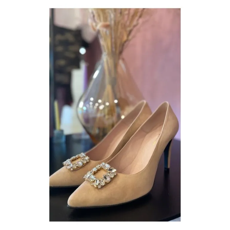 Den smukkeste stilet pumps fra Copenhagen Shoes i camel farvet ruskind, med en rigtig flot dekorativ smykke med sten på snuden. Hælen er 9 cm høj, og sidder godt på foden.