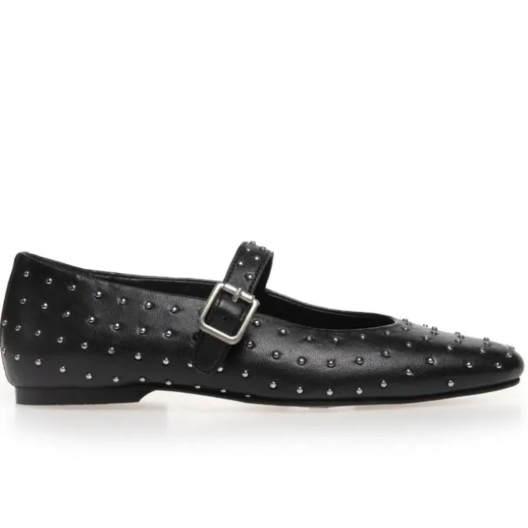 Super lækker ballerina sko fra Copenhagen Shoes i sort skind, med små sølvnitter rundt omkring. Skoen har en fin rem over foden, som gør at den sidder godt fast på foden.