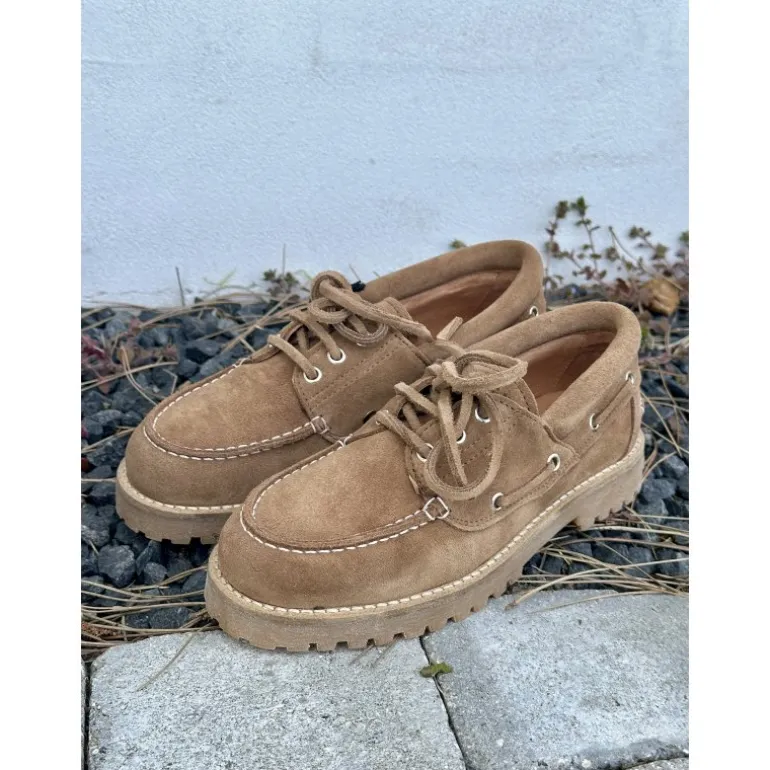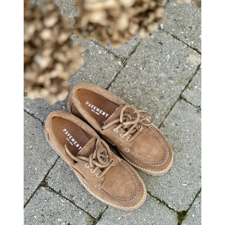 Meget lækker loafer fra Pavement i sandfarvet ruskind, med grove såler i sejlersko looket. Skoen har ekstra padding i sålen indvendigt, så de er meget bløde og komfortable at have på.