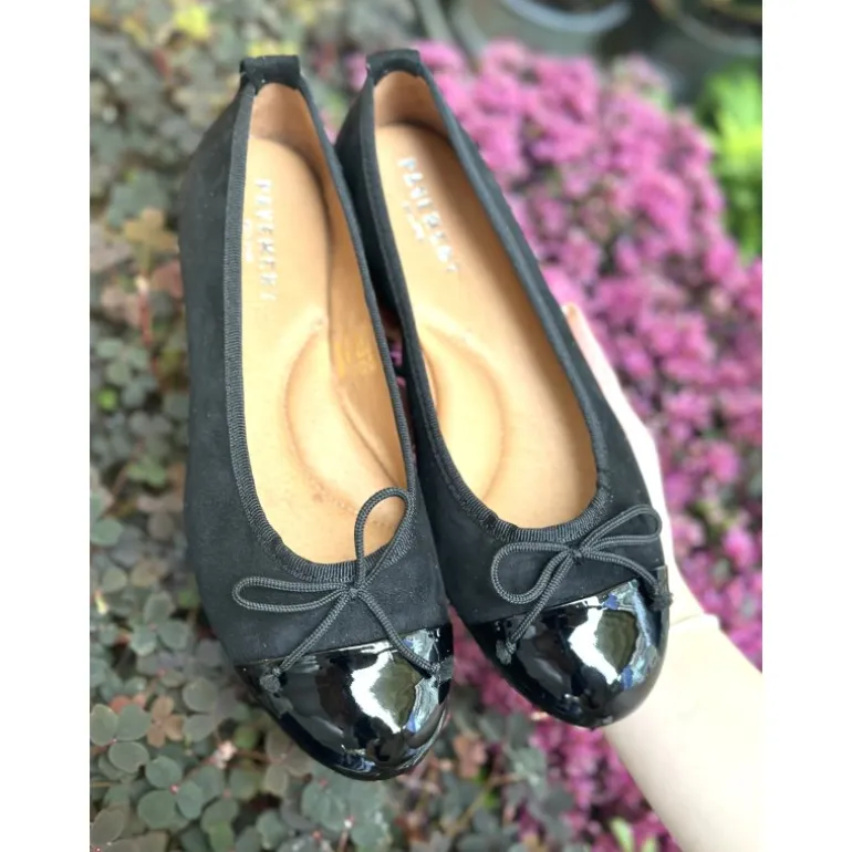 Super lækker ballerina sko fra Pavement i sort ruskind, med en laksnude samt sløjfe fortil. Sålerne er ekstra bløde indersåler, med puder og rigtig god komfort.