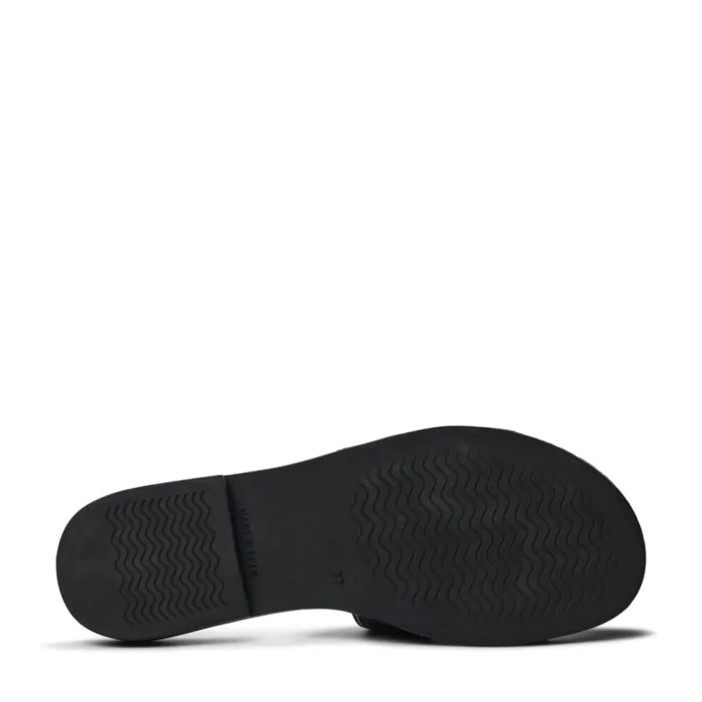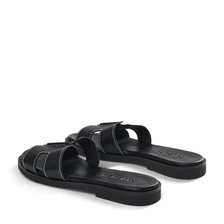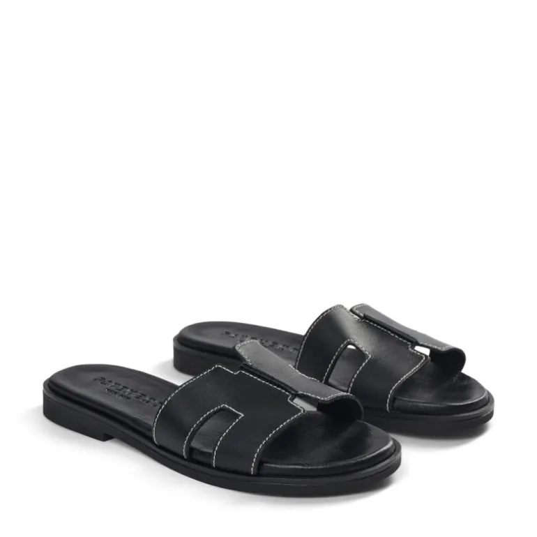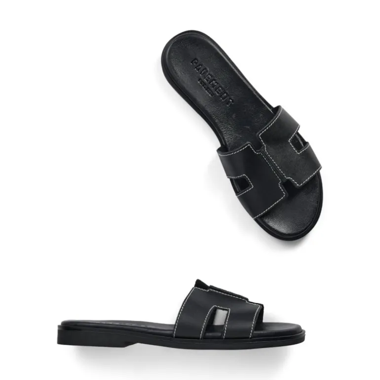 De populære slip in sandaler fra Pavement i sort læder, med meget bløde såler. Sandalen har en lys stikning hele vejen rundt.