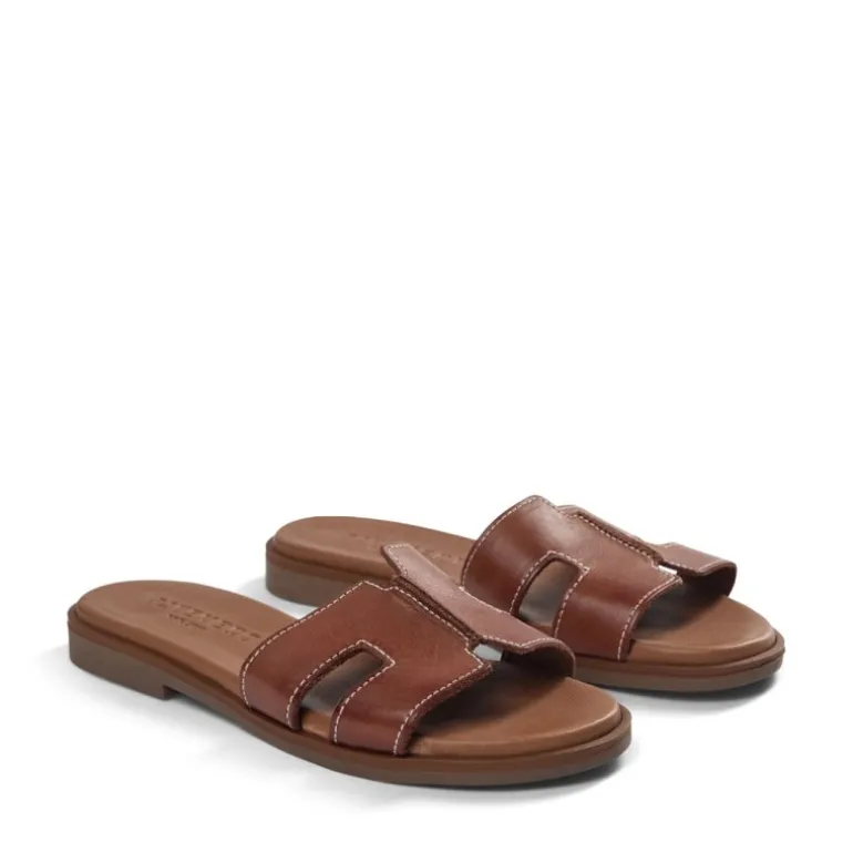 De populære slip in sandaler fra Pavement i cognac læder, med meget bløde såler. Sandalen har en lys stikning hele vejen rundt.