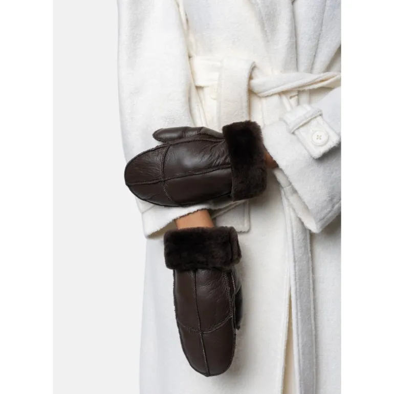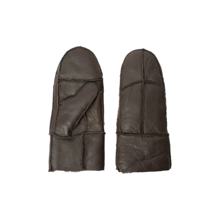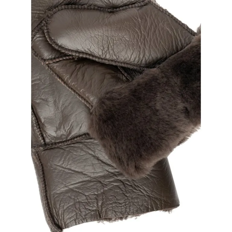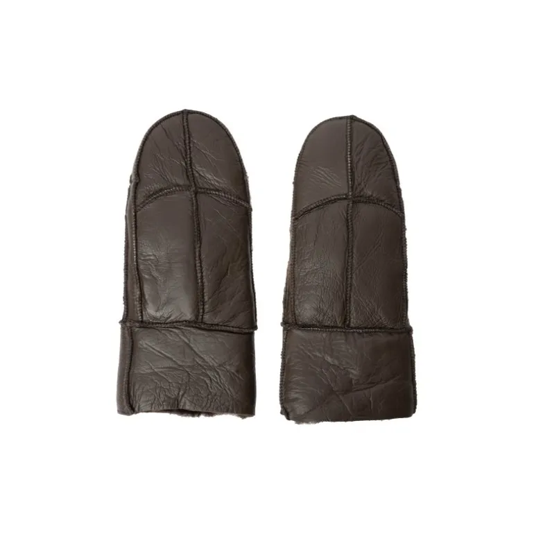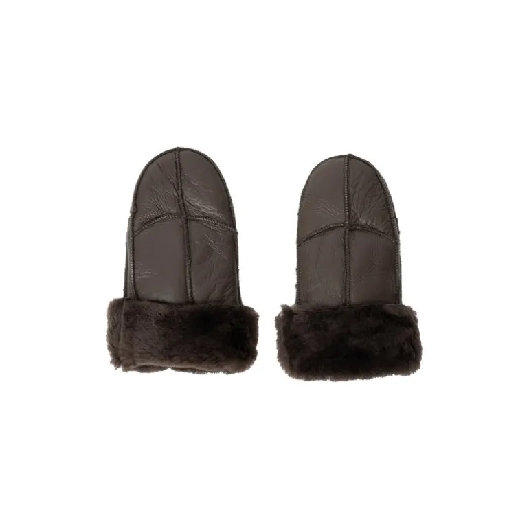 Skønne skindluffer i mørkebrun skind, med pelsfoer indvendigt. Øverste stykke af luffen kan foldes ned og op, så man får en detalje med pelskant