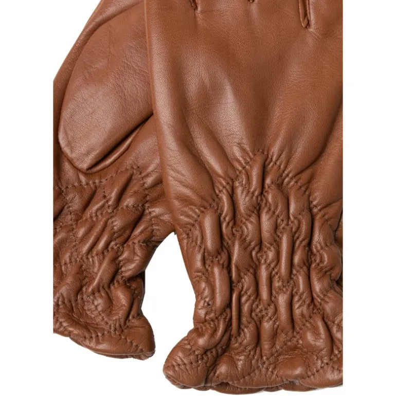 Meget lækre og elegante skindhandsker fra RE:DESIGNED i det skønneste bløde læder i cognac skind. Handsken har de fineste detaljer for oven, at lidt creppet skind, der lukker tæt om håndledet. Handsken har fleece foer, og derudover er der touch funktion, så man kan bruge dem på sin smartphone, uden at tage handskerne af.