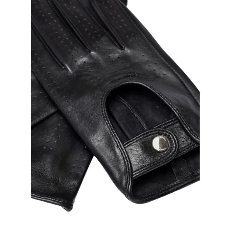 Rigtig smart lille kørehandske i sort skind fra RE:DESIGNED. Handskerne har fine detaljer, en hul ved håndryggen, og lukkes med en lille knap. Super smarte.