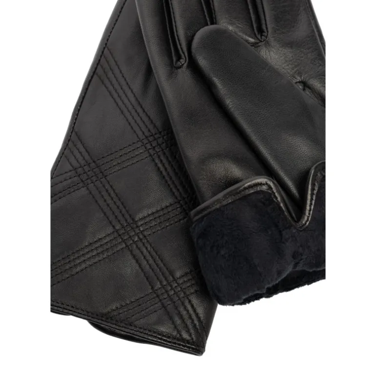 Flotte skindhandsker i sort skind, med flotte detaljer, i form at stikninger. Handsken har fleece foer, og derudover er der touch funktion, så man kan bruge dem på sin smartphone, uden at tage handskerne af.