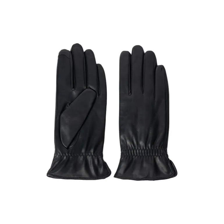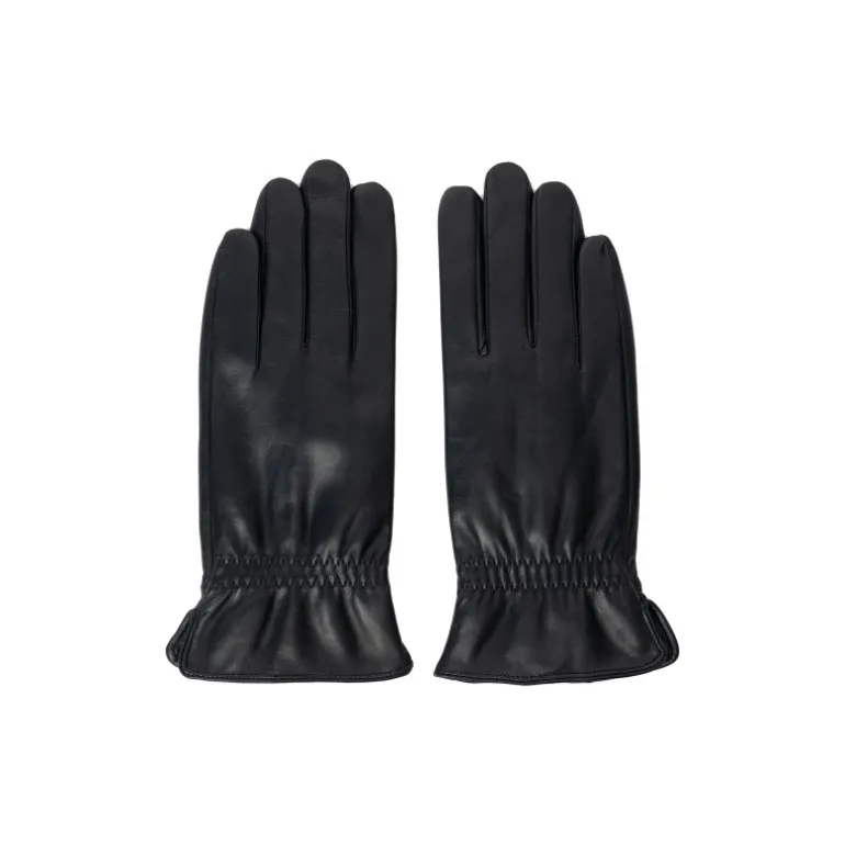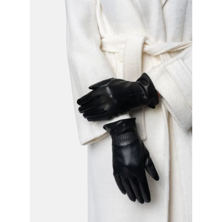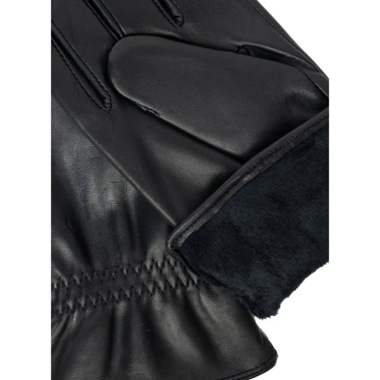 Lækre skindhandsker fra RE:DESIGNED i sort skind, med fine detaljer på. Handsken har fleece foer, og derudover er der touch funktion, så man kan bruge dem på sin smartphone, uden at tage handskerne af.