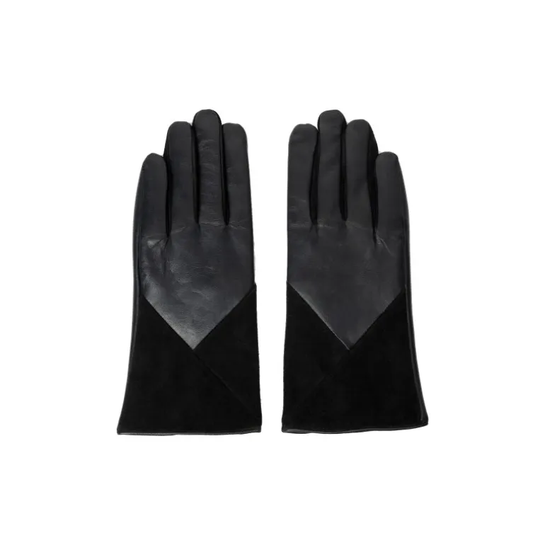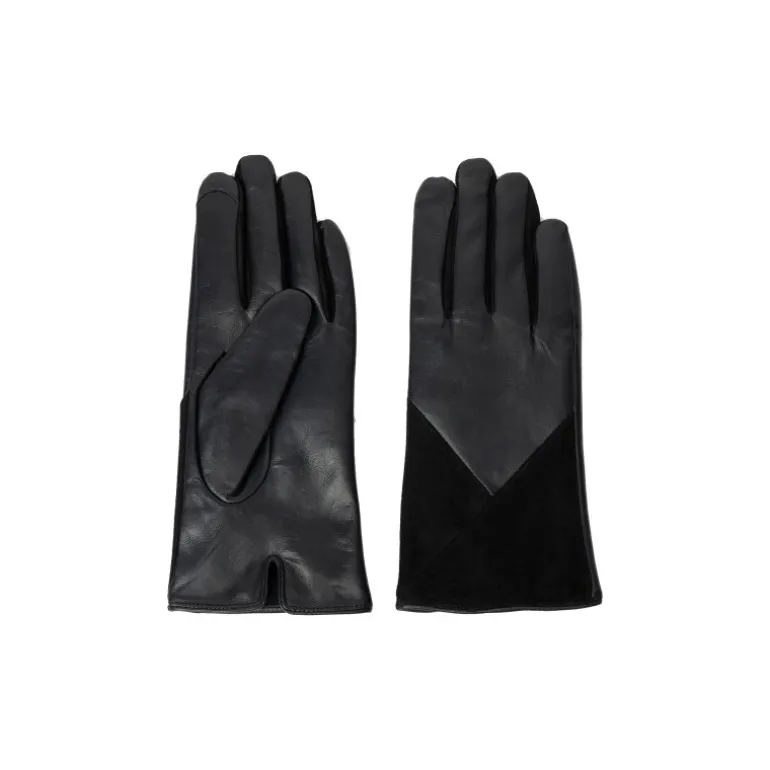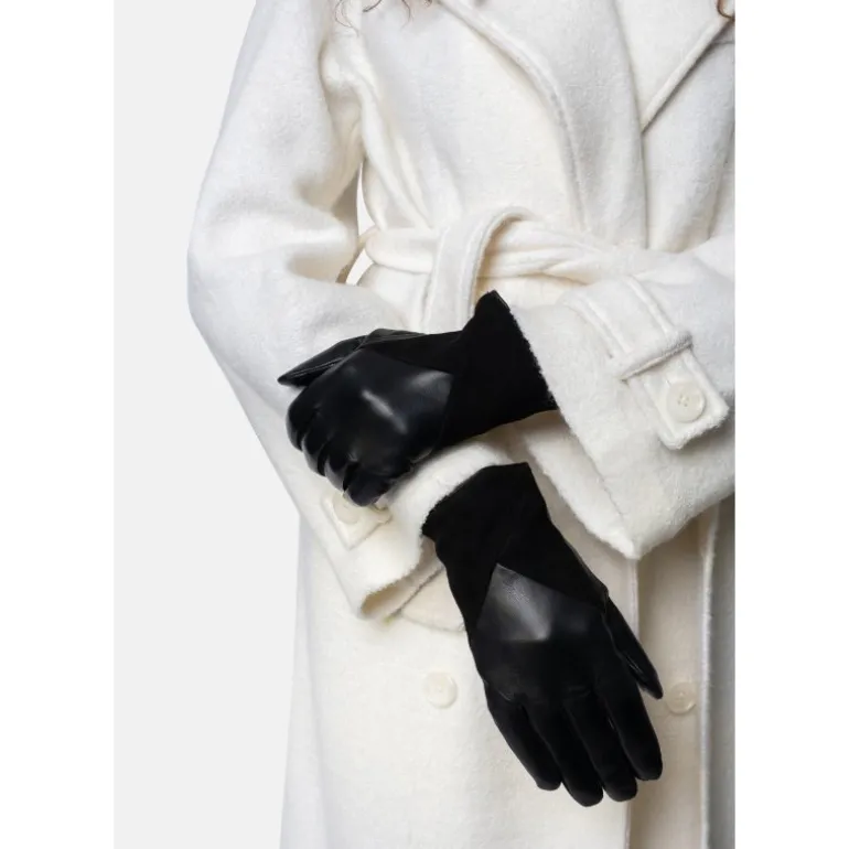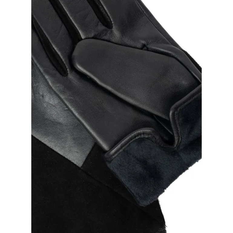 Lækre skindhandsker fra RE:DESIGNED i sort skind, kombineret med ruskindsdetaljer. Handsken har fleece foer, og derudover er der touch funktion, så man kan bruge dem på sin smartphone, uden at tage handskerne af.