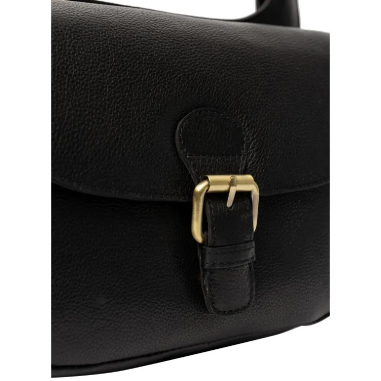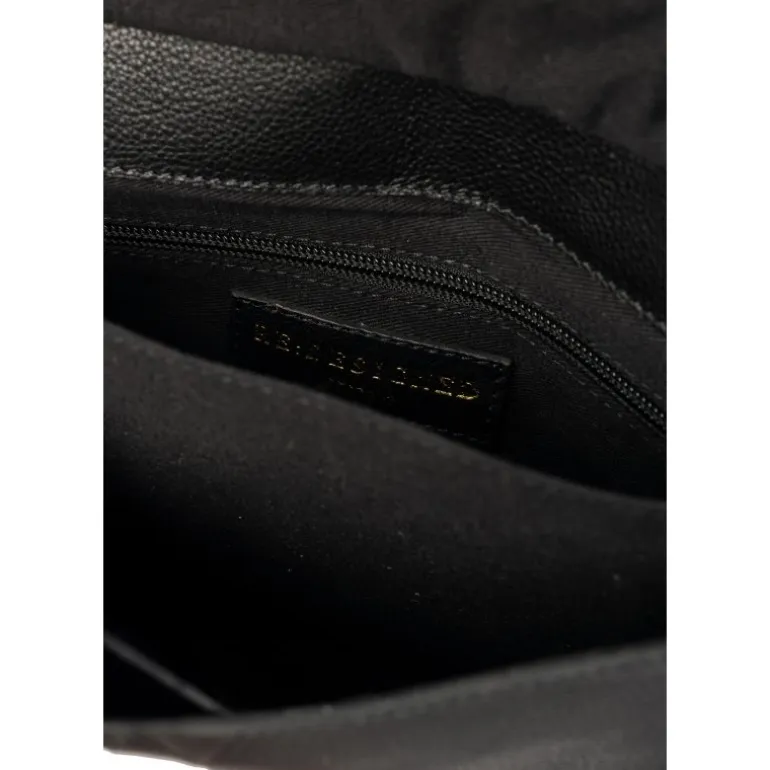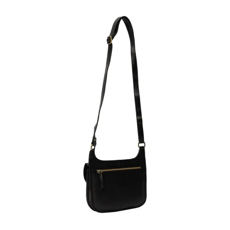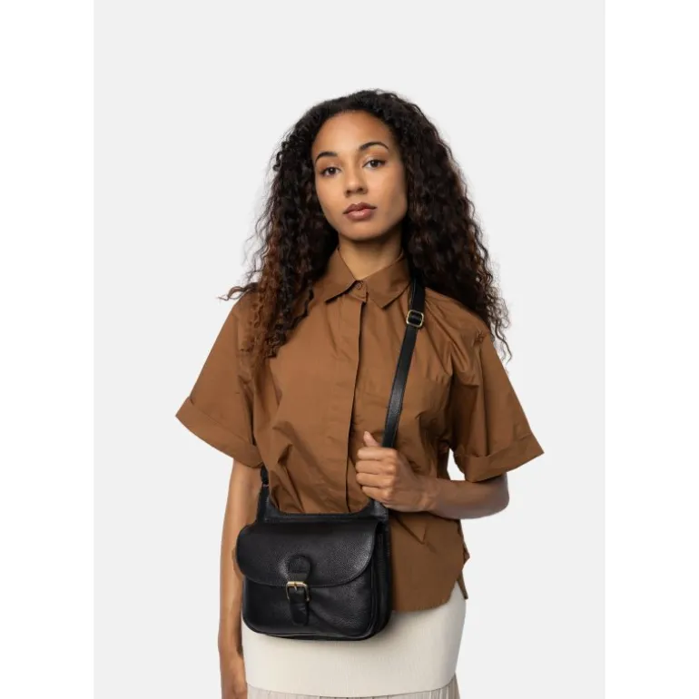 Super fin taske fra RE:DESIGNED i sort skind, med lang justerbar rem. Tasken lukkes med et lille tryk spænde, og har flere rum indvendigt.