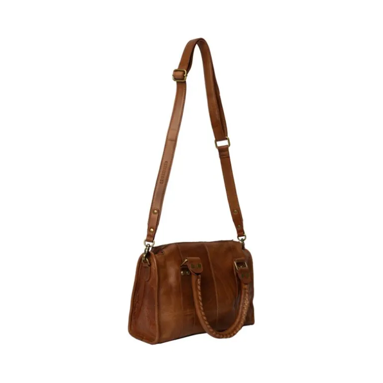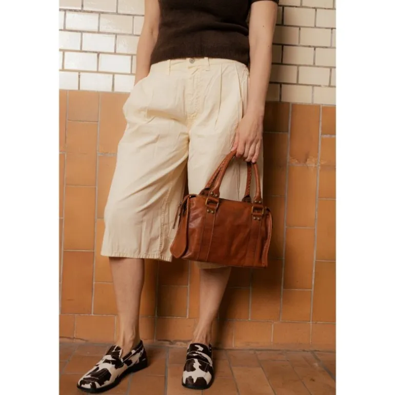 Meget lækker lille taske fra RE:DESIGNED, i den flotte valnød skind. Tasken har den flotteste hank, med snoede detaljer, og en lang cross over rem med. Taskens inddeling er et stort rum, med små rum i siderne, samt et lynlåserum.