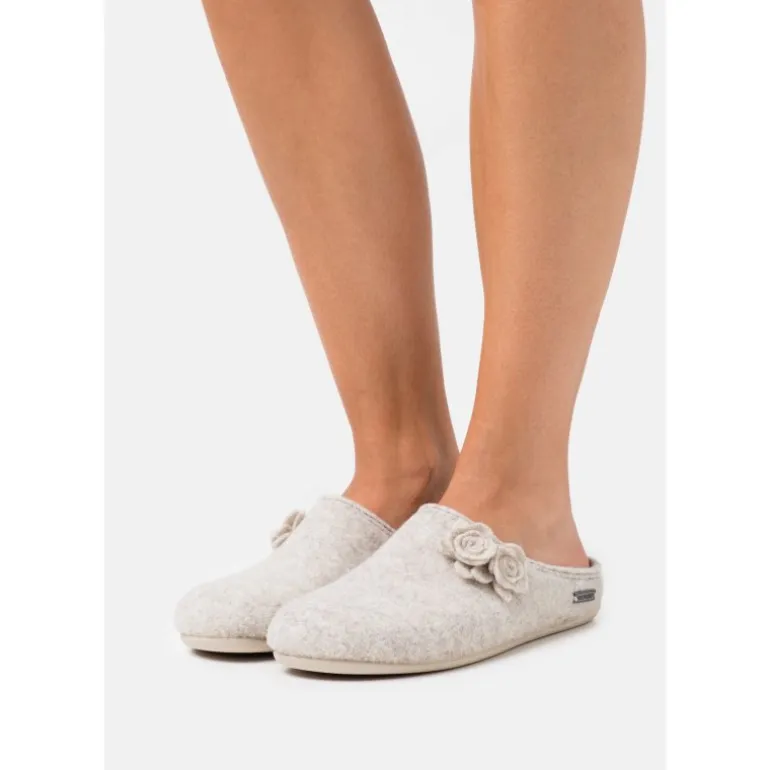 Lækre hjemmesko fra Shepherd i beige filt af fåreuld, med de fineste små blomster som dekoration. Faste gummisåler, og lige til at stikke i.