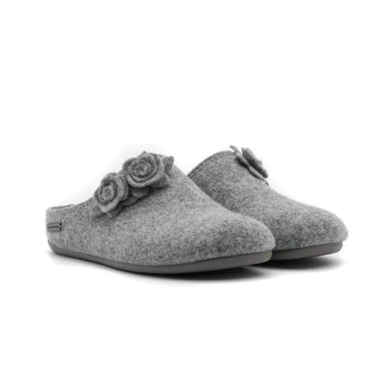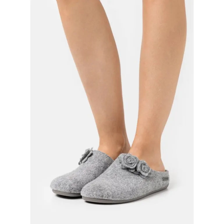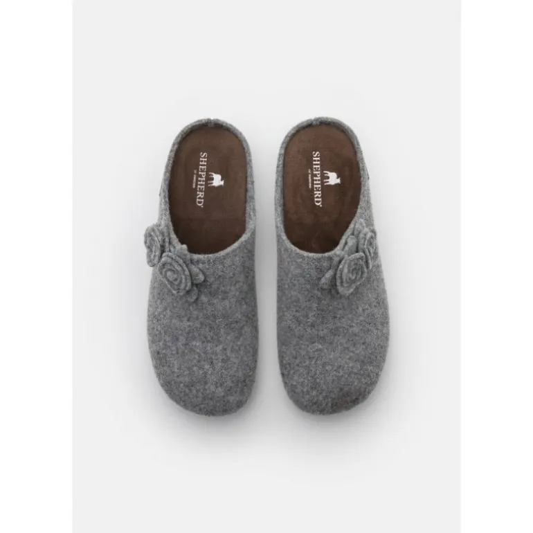 Lækre hjemmesko fra Shepherd i lysegrå filt af fåreuld, med de fineste små blomster som dekoration. Faste gummisåler, og lige til at stikke i.