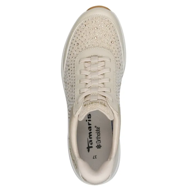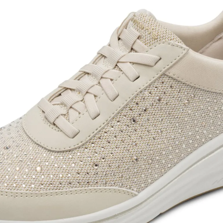 Meget smart og ekstra komfortabel sneakers fra Tamaris. Skoen er i en flot lys beige, med rhinsten der matcher i farven. Snørene er elastiksnøre, så skoen er lige til at stikke i. Ekstra bløde såler indvendigt