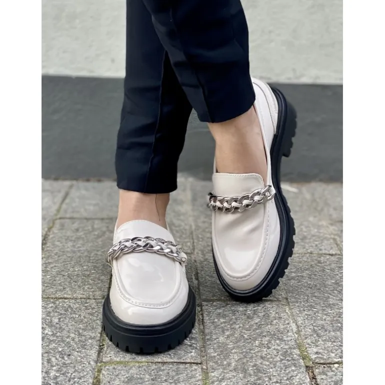 Vores Tamaris bedstseller loafer er nu også lavet i den fineste lyse lak, med sølvkæder. Fantastisk loafer sko med indersåler der er med “Touch it” og er ekstra bløde at have på, og slidsålerne er de super fede chunky gummisåler.