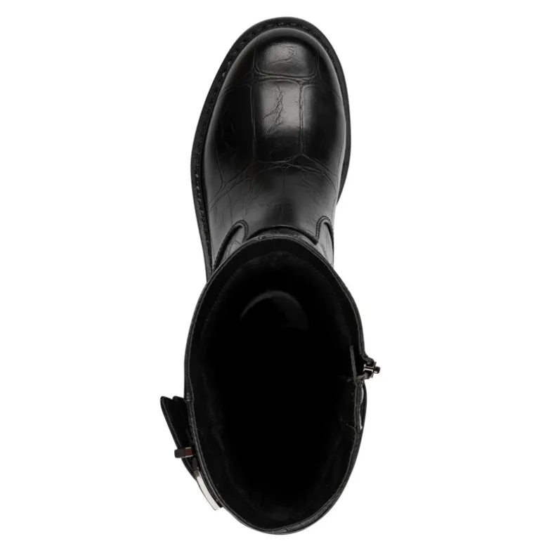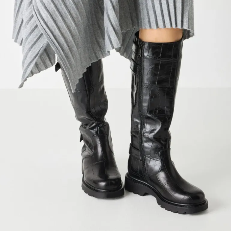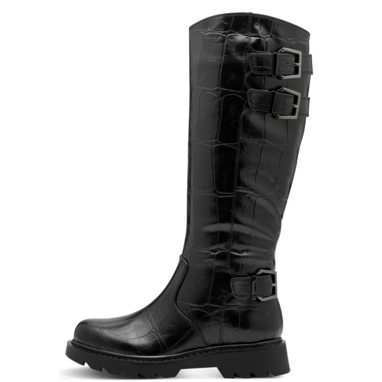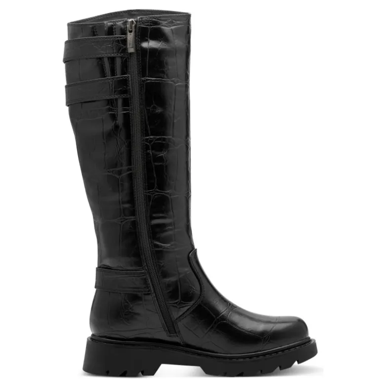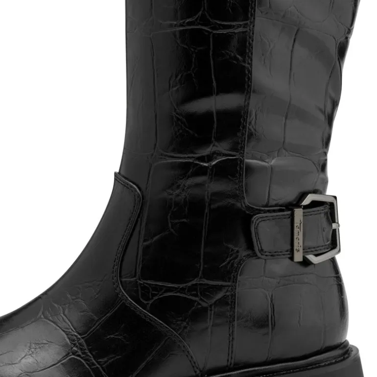 Smart langskaftet støvle fra Tamaris i kroko præget imiteret skind. Støvlen har lynlåse på indersiden, og smarte spænder på ydersiden.