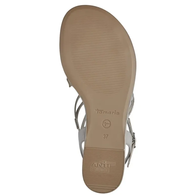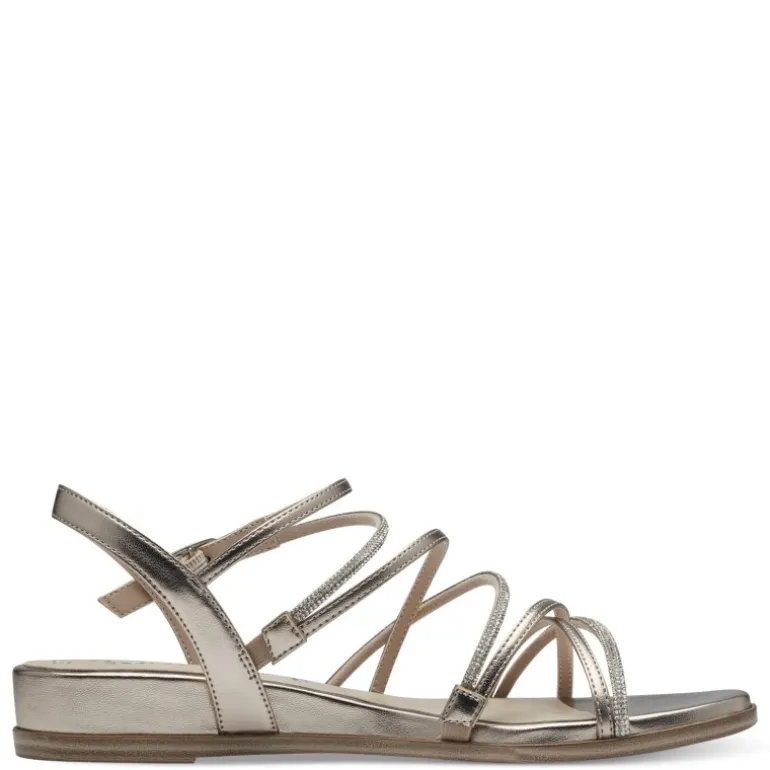 Meget smuk sandal fra Tamaris i guld skind, med fine glitter remme over foden. Sålen er en god komfortabel sål, med lidt tykkelse bagtil.