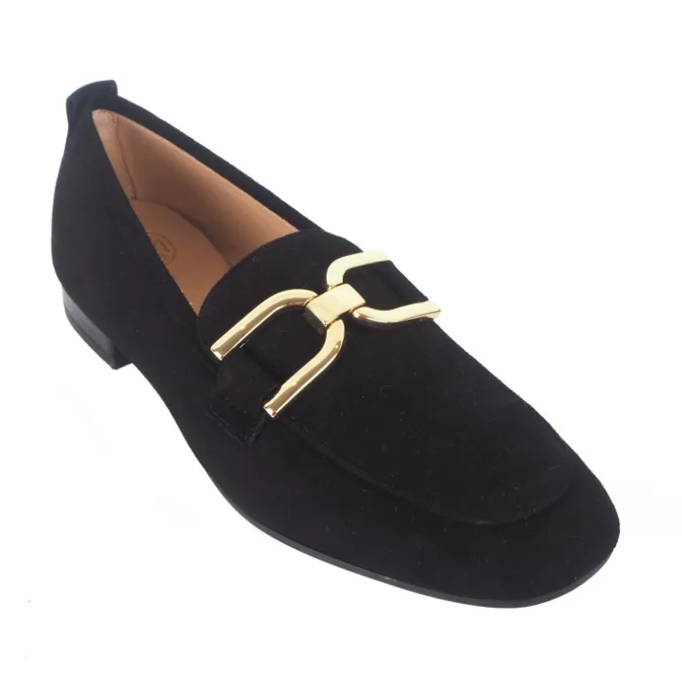 Meget elegant loafer fra Unisa i sort ruskind, med et flot guldspænde. Sålerne er bløde gummisåler og sidder fantastisk.